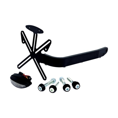 Used to install the license plate behind the rear tire. Kit includes a complete taillight set-up with nothing else required. The black anodized CNC machined aluminum mounting bracket installs directly to the bottom shock absorber bolt. Complete with license plate bracket (175x175mm Italian size), a miniature ECE approved LED taillight, turn signal brackets and required installation hardware.