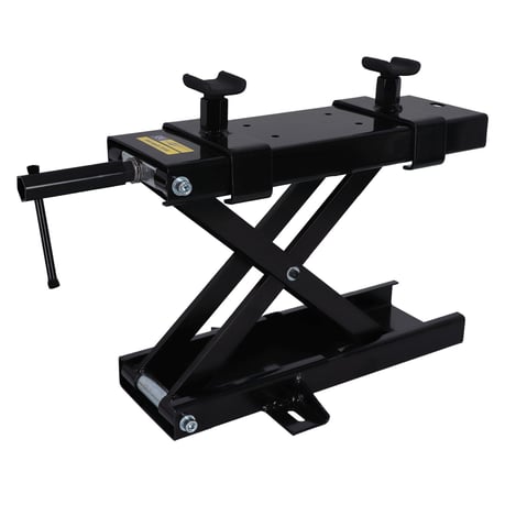 Black painted steel construction. The Deadlift is a dependable and sturdy mini-scissor style motorcycle lift, capable of lifting even the largest H-D Touring models with ease. Perfect for maintenance work on front or rear wheel. Includes two frame support brackets that are rubber coated to help prevent paint damage.