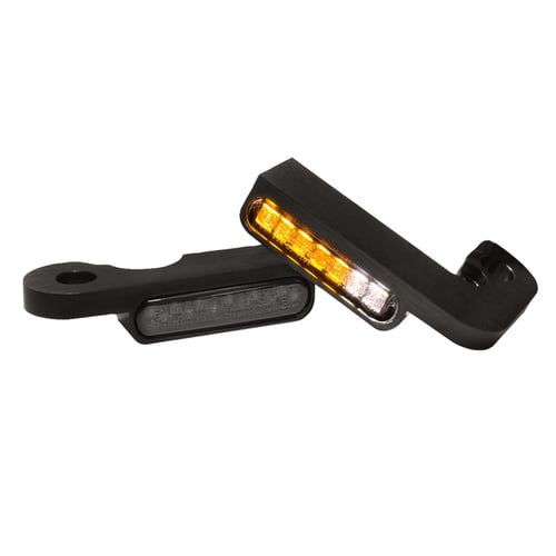 ECE approved. With position light. Black anodized CNC machined billet aluminum housing. Super slim and extremely bright LED front turn signals with a white position light for additional safety. Installs below the handlebar for an inconspicuous front turn signal set-up.