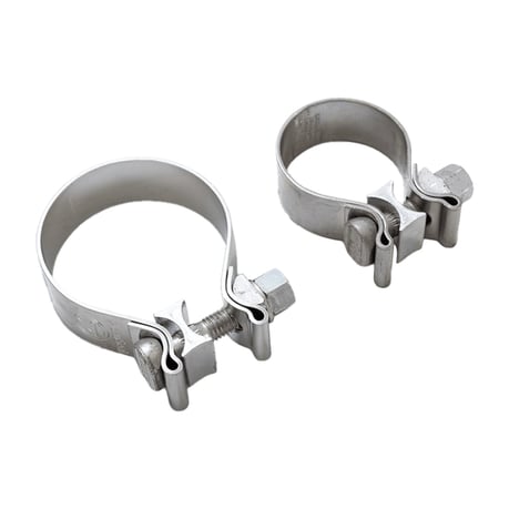 Set includes 1.75″ stainless steel clamp for left muffler and a 2.5″ for the right.